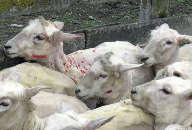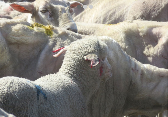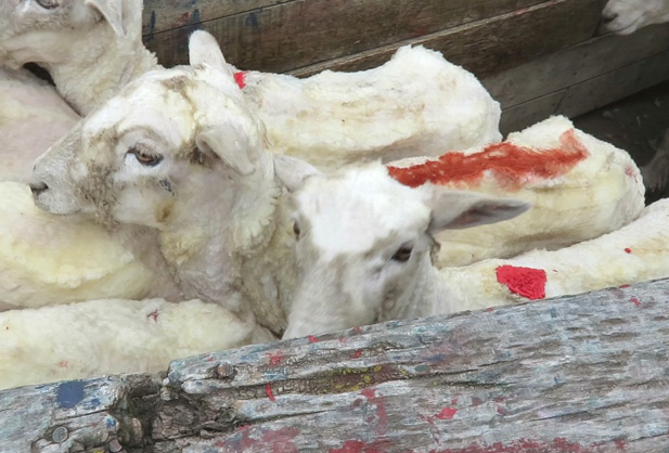 Sheep were crammed tightly into sheds before being sheared. As is common in the wool industry, rough, fast shearing left many sheep cut and bleeding. One worker poured oil over a sheep's bloody wound, and another sprayed a wound with insecticide. Workers also kicked, shoved, stamped and stepped on the sheep, as well as striking them with a rake to push them out of the shearing shed. The eyewitness never saw them receive any veterinary care, even for gaping wounds.