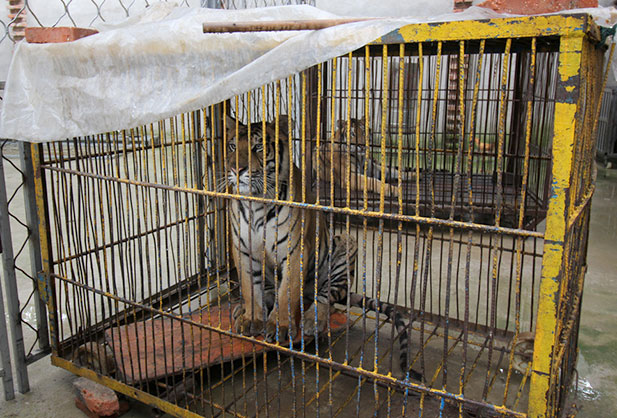 When not being forced to perform, big cats were confined to barren cages with little space to move around in. Many were forced to wear chains around their necks and could take only a few steps in any direction. Only one of the 10 facilities toured by the investigator had an indoor area in which tigers could find relief from the sweltering heat.