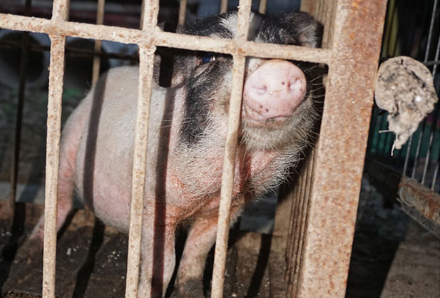 Other animals, such as dogs, llamas and pigs, were also kept in decrepit conditions and forced to perform. A senior dog, named Laifu by the investigator and too old to perform, was forced to live in this cage 24 hours day and never let out: