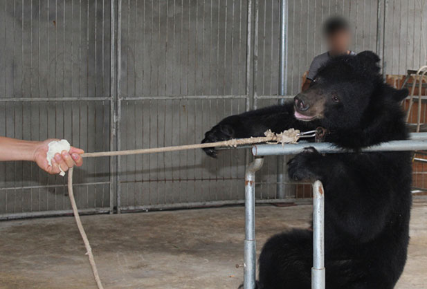 PETA Asia's investigator documented that bear cubs are chained or tethered to a wall and forced to remain upright, sometimes for hours, in order to train them to walk on their hind legs. If they can't hold themselves up, they risk choking and hanging themselves.