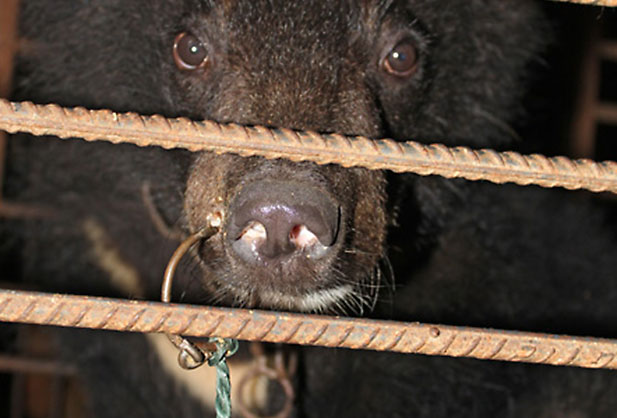 When they weren't being forced to perform, the bears were confined to cramped, barren cages. They cried out, pawing and biting at the bars, desperate to escape. Some had their snouts pierced with metal rings, which were used to lead them around. Such procedures are frequently performed without any pain medication. A bear, named Doudou by the investigator, was yanked by the rope around her neck and forced to walk on parallel bars. If she stopped or made a mistake, she was hit with a stick.